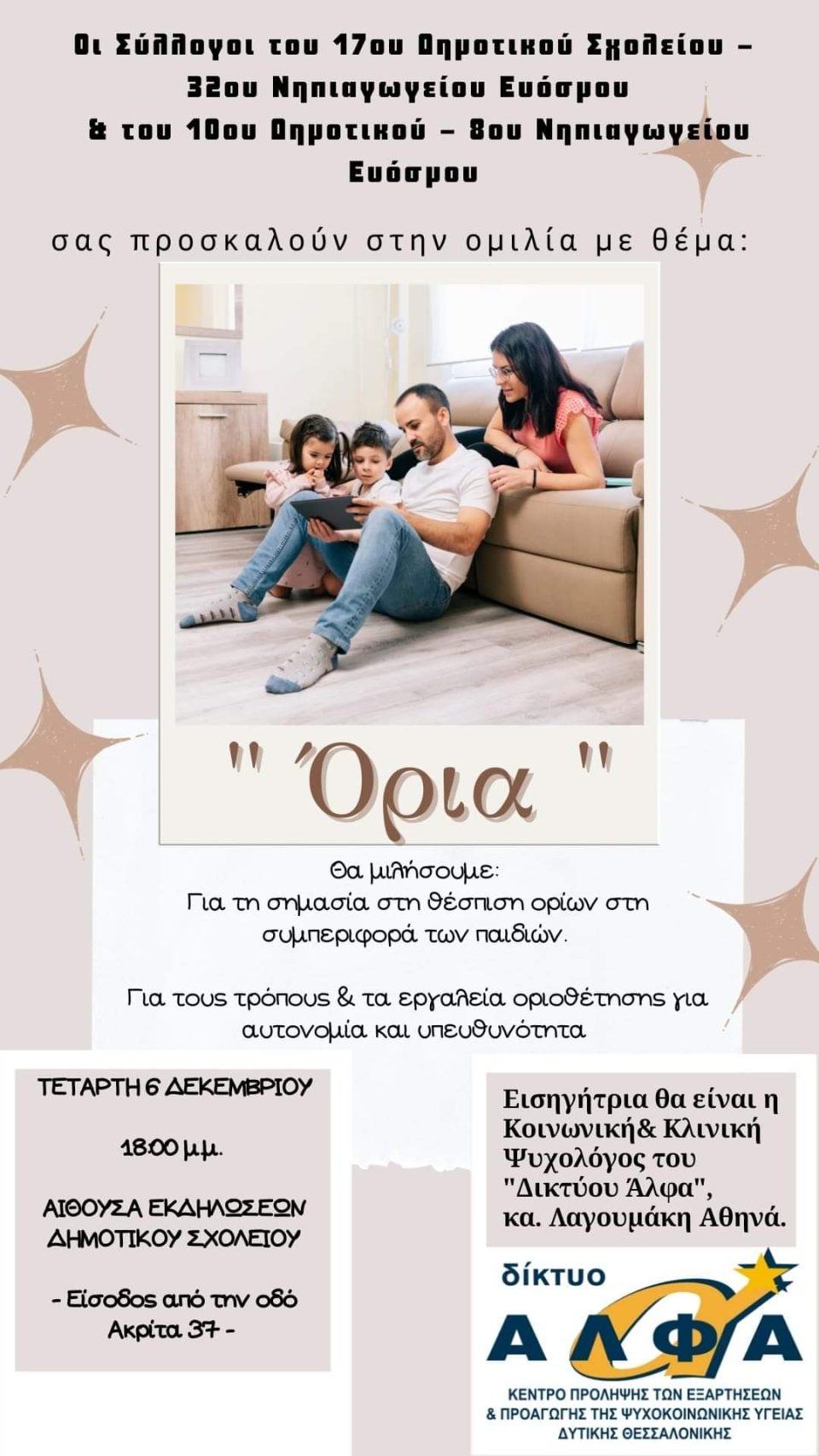 Μία πολύ ενδιαφέρουσα εκδήλωση συνδιοργανώνουν για τον μήνα Δεκέμβριο οι Σύλλογοι Γονέων & Κηδεμόνων του 17ου Δημοτικού Σχολείου και του 32ου Νηπιαγωγείου Ευόσμου, του 10ου Δημοτικού Σχολείου και του 8ου Νηπιαγωγείου Ευόσμου και προσκαλούν όλους τους γονείς να την παρακολουθήσουν αύριο ΤΕΤΑΡΤΗ 6 ΔΕΚΕΜΒΡΙΟΥ 2023, στις 18:00 μ.μ. – 20:00 μ.μ. στην Αίθουσα Εκδηλώσεων Δημοτικού Σχολείου -Είσοδος από την οδό Ακρίτα 37 ..
