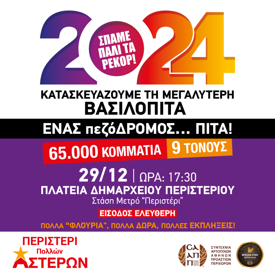 Η Συντεχνία Αρτοποιών Αθηνών, Προαστίων & Περιχώρων και ο Δήμος Περιστερίου σε μια μοναδική γιορτή θα δημιουργήσουν και φέτος τη μεγαλύτερη Βασιλόπιτα, με περισσότερα από 65.000 κομμάτια και πολλά φλουριά που θα αντιστοιχούν σε δώρα.