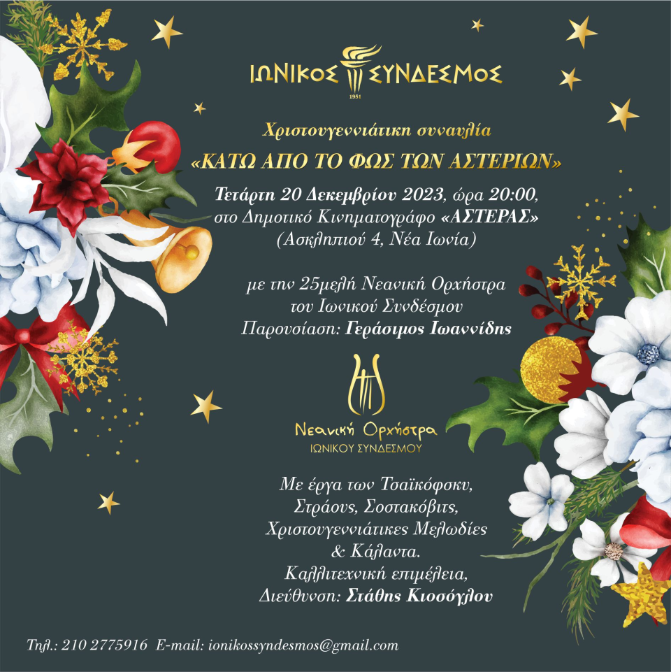 Χριστουγεννιάτικη συναυλία με τίτλο «ΚΑΤΩ ΑΠΟ ΤΟ ΦΩΣ ΤΩΝ ΑΣΤΕΡΙΩΝ» θα πραγματοποιηθεί την Τετάρτη 20 Δεκεμβρίου 2023, ώρα 20.00, στο Δημοτικό Κινηματογράφο «ΑΣΤΕΡΑΣ» ( Ασκληπιού 4, Νέα Ιωνία ) με την 25μελή Νεανική Ορχήστρα του Ιωνικού Συνδέσμου.