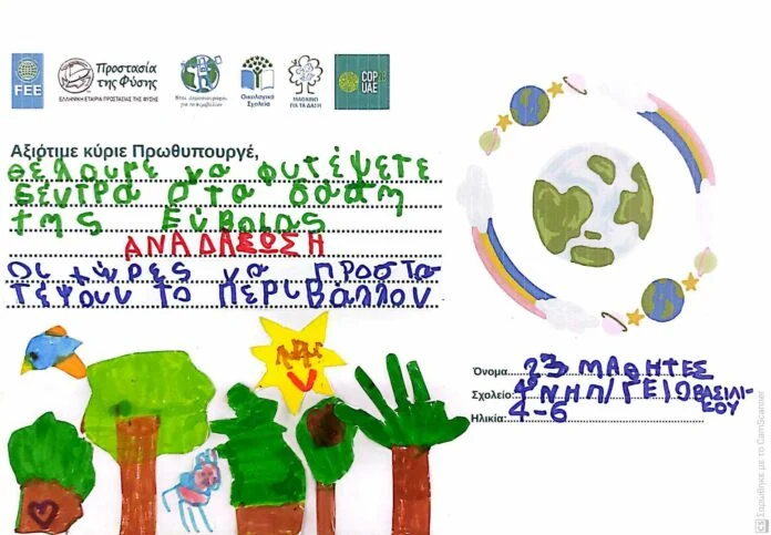 4.000 μαθητές και μαθήτριες από όλη την Ελλάδα ένωσαν τις ανησυχίες τους για το περιβάλλον και την κλιματική κρίση, στέλνοντας μηνύματα και κάρτες προς τον πρωθυπουργό, Κυριάκο Μητσοτάκη, με αφορμή την έναρξη της COP28.