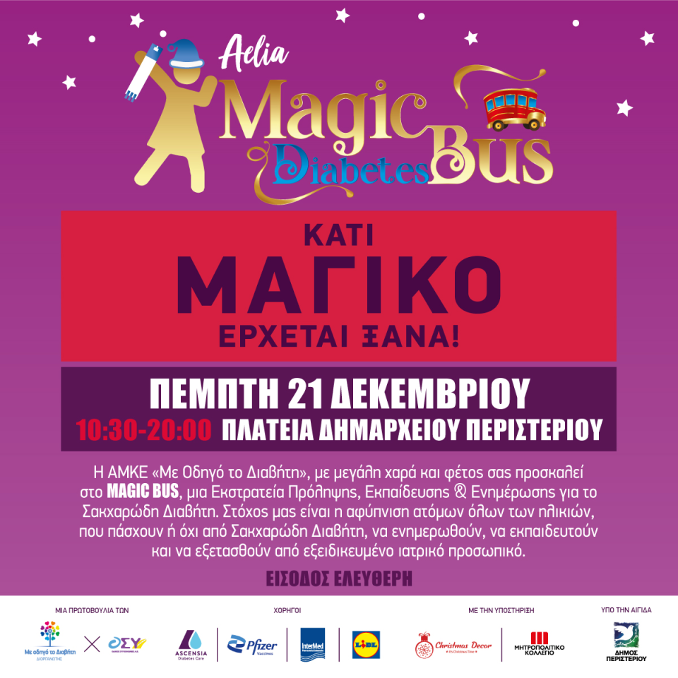 Tο Μαγικό Λεωφορείο του Διαβήτη της ΑΜΚΕ “Με Οδηγό τον Διαβήτη” και το ΚΕΠ Υγείας Δήμου Περιστερίου σας προσκαλούν την Πέμπτη 21 Δεκεμβρίου 2023, από τις 10.00 έως τις 21.00, στην πλατεία Δημαρχείου – στάση Μετρό «Περιστέρι». Είσοδος Ελεύθερη!