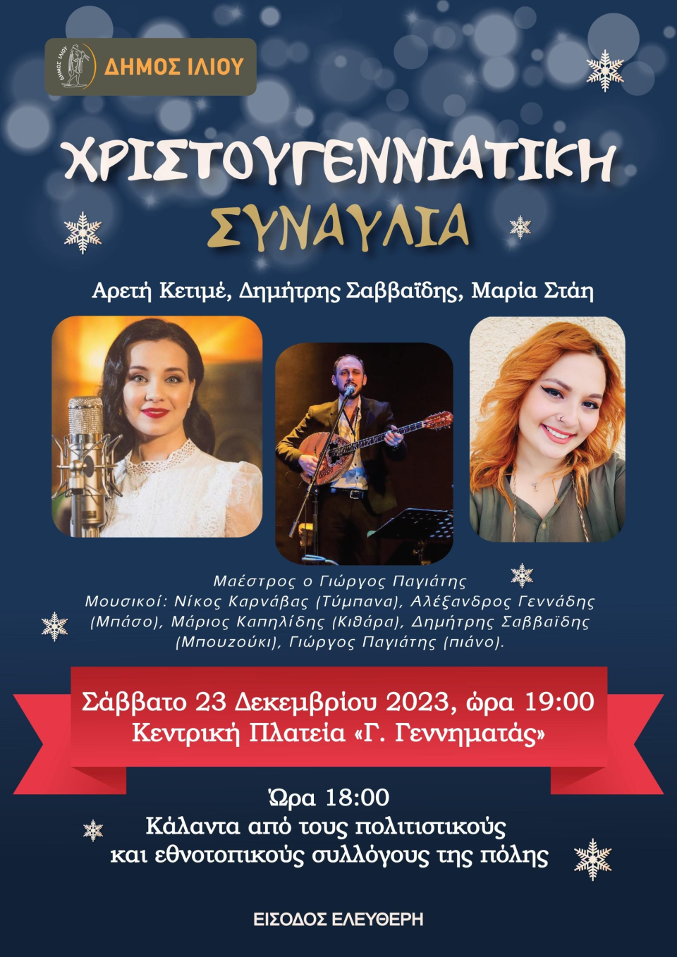 Ο Δήμος Ιλίου σας προσκαλεί το Σάββατο 23 Δεκεμβρίου στη Χριστουγεννιάτικη συναυλία με τους Αρετή Κετιμέ, Δημήτρη Σαββαϊδη και Μαρία Στάη, στην κεντρική πλατεία “Γεώργιος Γεννηματάς” στο Ίλιον και ώρα 19:00.