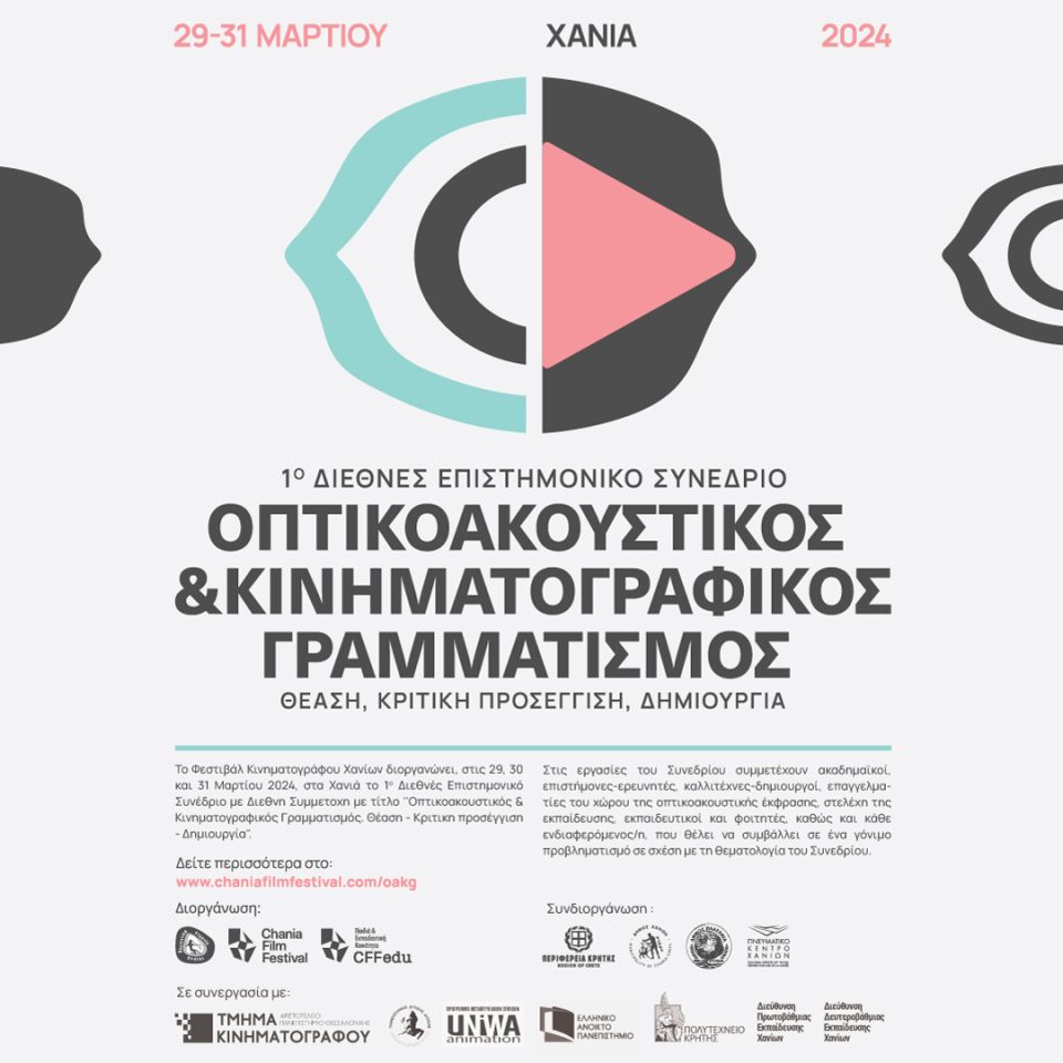 Το Φεστιβάλ Κινηματογράφου Χανίων διοργανώνει, στις 29, 30 και 31 Μαρτίου 2024, στα Χανιά το 1ο Πανελλήνιο Επιστημονικό Συνέδριο με Διεθνή Συμμετοχή με τίτλο “Οπτικοακουστικός – Κινηματογραφικός Γραμματισμός. Θέαση – Κριτική προσέγγιση – Δημιουργία”.