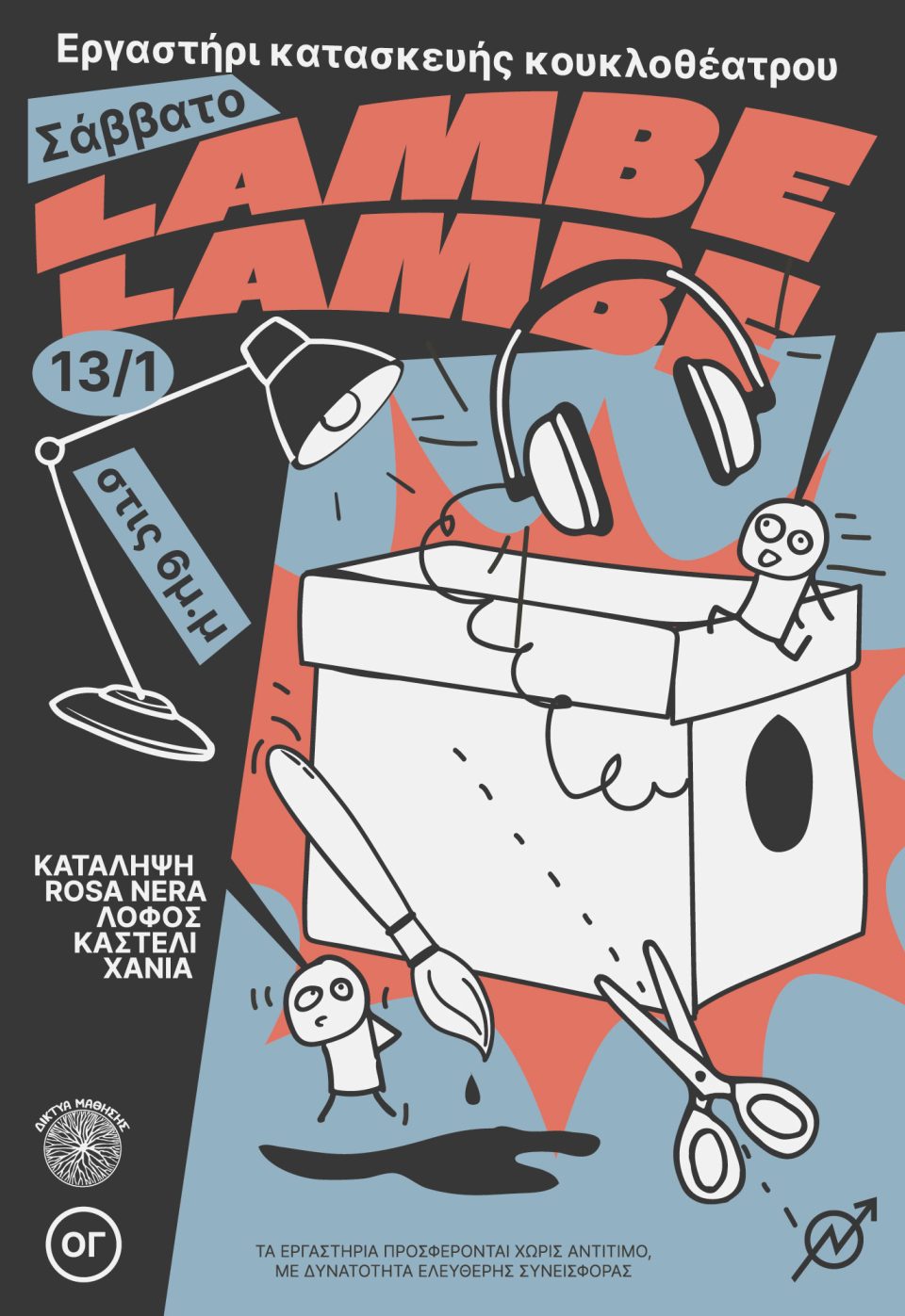 Ένα μήνα πριν συναντηθήκαμε με τον Γιώργο Γελαλή και μας παρουσίασε την τεχνική κουκλοθέατρου lambe lambe. Μια ιδιαίτερη μορφή κουκλοθέατρου που απευθύνεται σε ένα μόνο άτομο και διαδραματίζεται..σχεδόν σαν μυστικό… μέσα σε ένα κουτί. Αφού συναντηθήκαμε και εμπνευστήκαμε , αποφασίσαμε να ξαναβρεθούμε για να δοκιμάσουμε τα ίδια τελικά να φτιάξουμε τη δικιά μας ιστορία σε κουτί. Υλικά για κατασκευές ευπρόσδεκτα. Μικρές ιστορίες -μέχρι 3′- επίσης ευπρόσδεκτες!