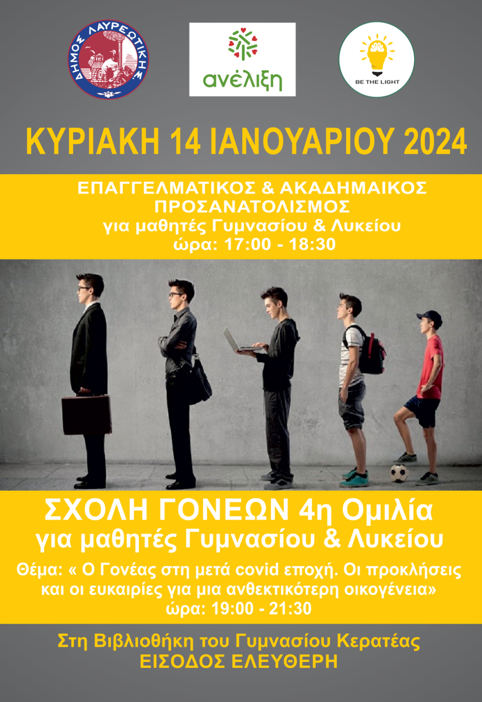 Ο Δήμος Λαυρεωτικής σε συνεργασία με τον μη-κερδοσκοπικό οργανισμό “ΑΝΕΛΙΞΗ” και τους συλλόγους Γονέων και Κηδεμόνων των Σχολικών μονάδων Δευτεροβάθμιας Εκπαίδευσης συνεχίζει την Σχολή Γονέων και τα εργαστήρια Επαγγελματικού Προσανατολισμού.