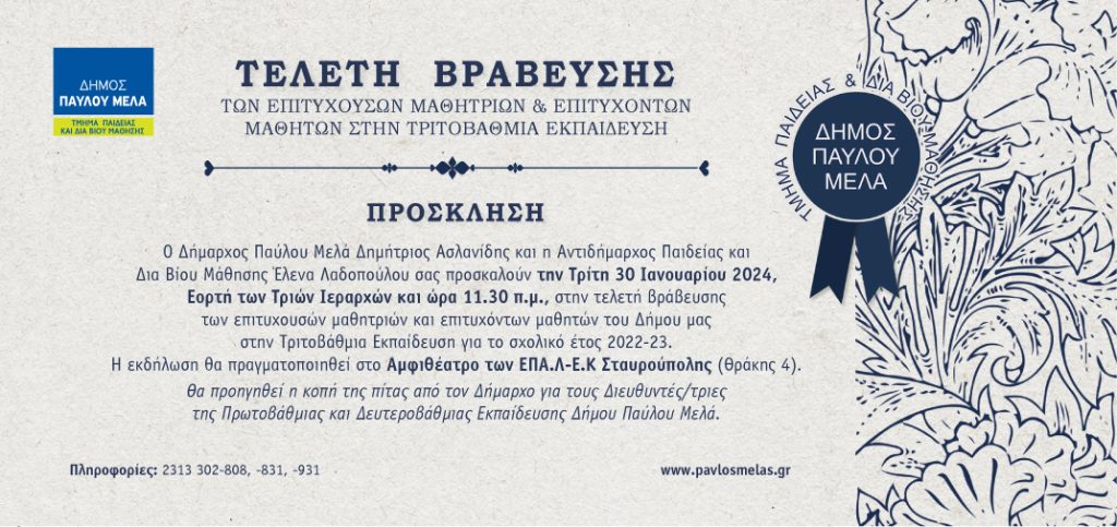 ΚεντρικήΚοινωνικάΟ Δήμος Παύλου Μελά επιβραβεύει τους εισαχθέντες στην Τριτοβάθμια Εκπαίδευση by xristiana20 Ιανουαρίου 202420 Ιανουαρίου 20240441 Share00 20/1/2024