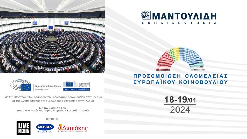 Τα Εκπαιδευτήρια Ε. Μαντουλίδη, με την έγκριση του ΥΠΑΙΘ, διοργανώνουν την Πέμπτη και Παρασκευή, 18 και 19 Ιανουαρίου 2024 «Προσομοίωση Συνεδρίασης Ολομέλειας του Ευρωπαϊκού Κοινοβουλίου» για μαθητές της Α΄/Β΄ Λυκείου όλων των σχολείων της Ελλάδας.