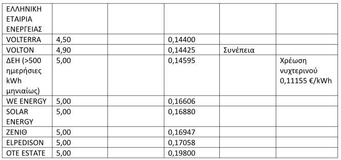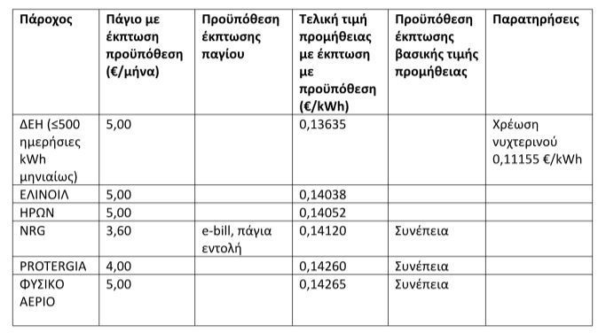 Ο ανταγωνισμός λειτούργησε στο ειδικό, πράσινο τιμολόγιο, με την πλειονότητα των παρόχων να προσφέρει τιμές κάτω των 0,15 ευρώ/kWh και ελάχιστους να κινούνται σε υψηλότερα επίπεδα. Το φθηνότερο πράσινο τιμολόγιο (για καταναλώσεις κάτω των 500 kWh) ανακοινώθηκε από την ΔΕΗ, με την τιμή χρέωσης να διαμορφώνεται σε 0,136 ευρώ/kWh, ακολούθησαν: ΕΛΙΝΟΙΛ με 0,14038 ευρώ/kWh, ΗΡΩΝ με 0,14052 ευρώ/kWh, NRG με 0,14120 ευρώ/kWh, PROTERGIA με 0,14260 ευρώ/kWh κ.λπ., ενώ στην τριάδα των ακριβότερων πράσινων τιμολογίων συμπεριλαμβάνονται οι: ΟΤΕ ESTATE (0,198 ευρώ/kWh), ELPEDISON (0,17058 ευρώ/kWh) και ΖΕΝΙΘ (0,16947 ευρώ/kWh).