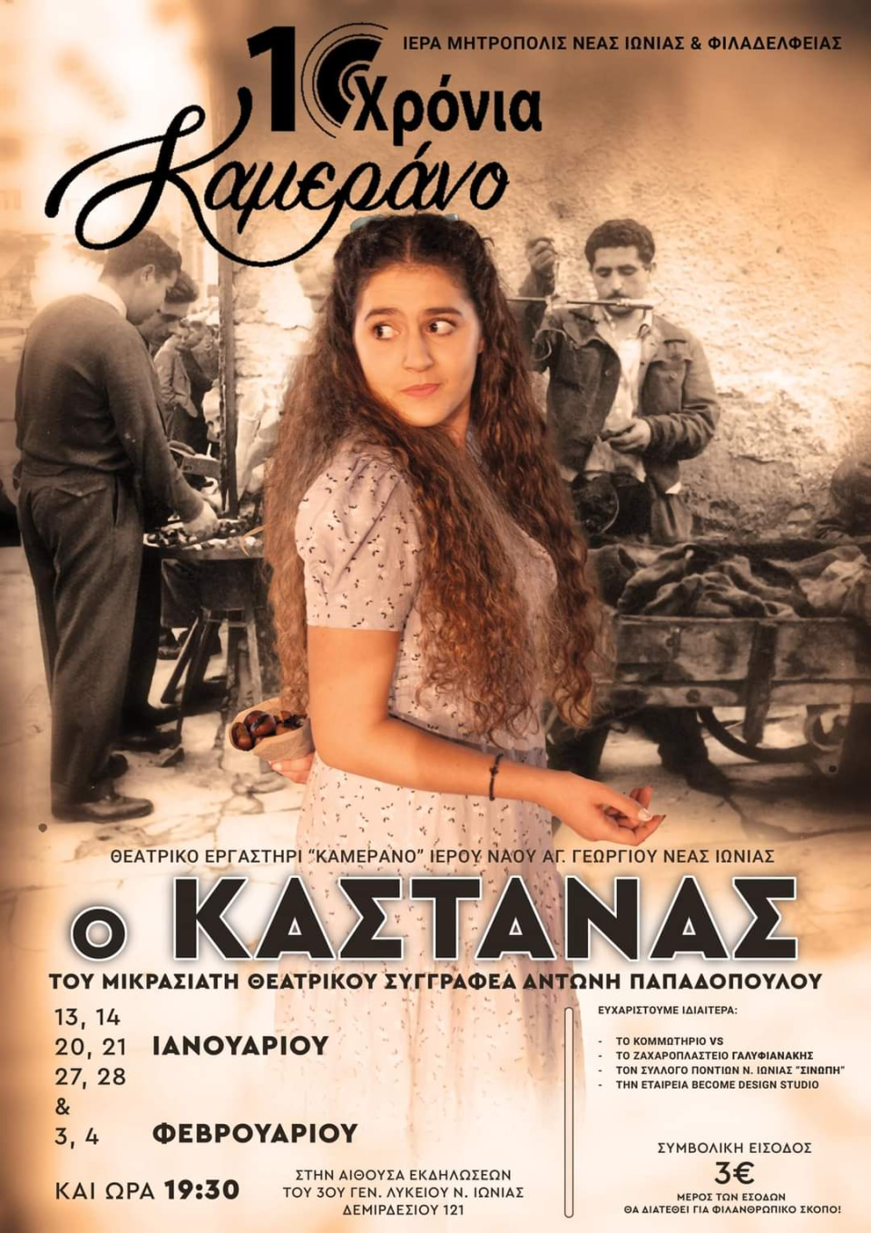 Το Θεατρικό Εργαστήρι “Καμεράνο” του Ιερού Ναού Αγίου Γεωργίου Νέας Ιωνίας Αττικής κλείνει τα 10 χρόνια παρουσίας και δημιουργίας, παρουσιάζοντας εκ νέου, μετά την απαίτηση του κόσμου, την θεατρική κωμική παραγωγή του: “Ο Καστανάς”, του μικρασιάτη θεατρικού συγγραφέα Α. Παπαδόπουλου, σε σκηνοθεσία του π. Δανιήλ Γκαμουλάκου.