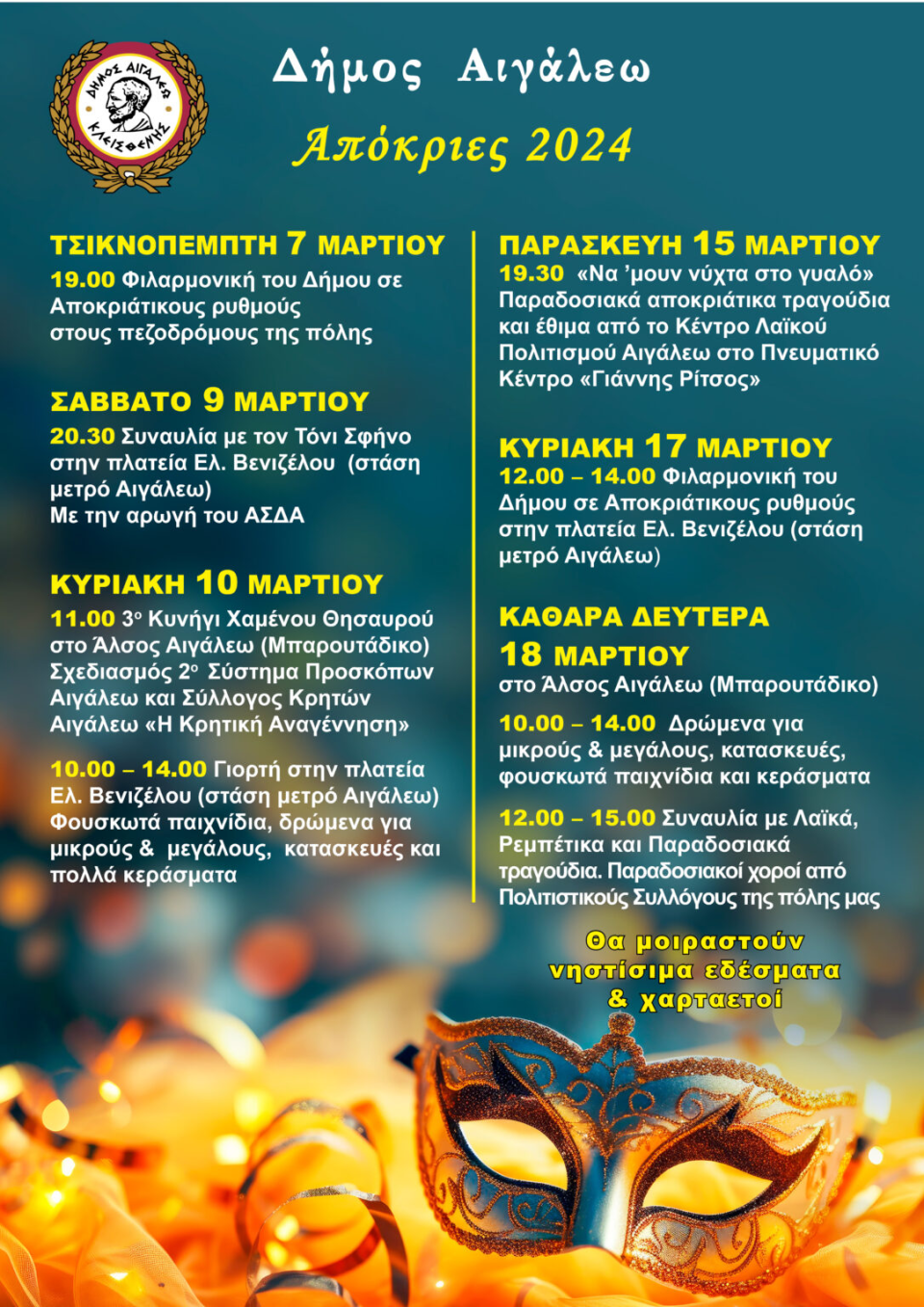 Ο Δήμος Αιγάλεω πρόκειται να γιορτάσει τις Απόκριες και την Καθαρά Δευτέρα 2024 από τις 7 Μαρτίου έως και την Καθαρά Δευτέρα 18 Μαρτίου, διάστημα κατά το οποίο θα πραγματοποιηθούν εκδηλώσεις για μικρούς και μεγάλους που θα προσφέρουν χαρά και διασκέδαση.