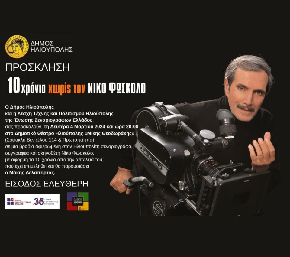 Μια βραδιά τιμής και αγάπης για τον Νίκο Φώσκολο διοργανώνουν ο Δήμος Ηλιούπολης και η Λέσχη Τέχνης και Πολιτισμού Ηλιούπολης της Ένωσης Σεναριογράφων Ελλάδος, τη Δευτέρα 4 Μαρτίου 2024 και ώρα 20:00, στο Δημοτικό Θέατρο «Μίκης Θεοδωράκης», στην Ηλιούπολη (Σοφοκλή Βενιζέλου 114 & Πρωτόπαπα).