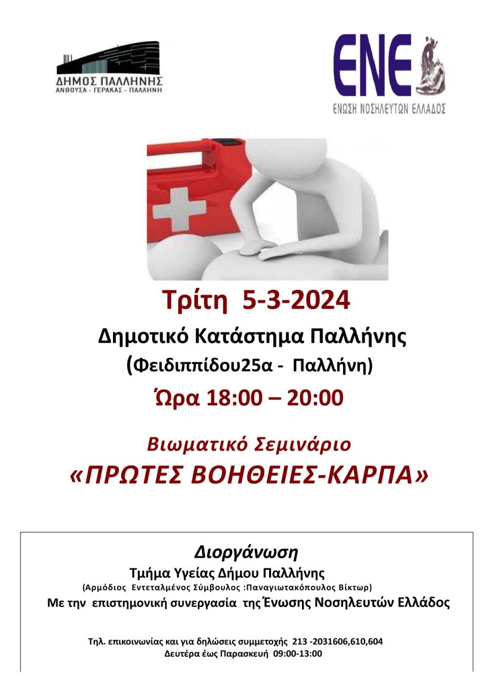 ΚεντρικήΚοινωνικάΒιωματικό Σεμινάριο “Πρώτες Βοήθειες – Κάρπα” στο Δημοτικό Κατάστημα Παλλήνης στις 5 Μαρτίου by xristiana21 Φεβρουαρίου 202426 Φεβρουαρίου 20240403 Share00 21/2/2024 Πηγή: https://www.xtypos.gr