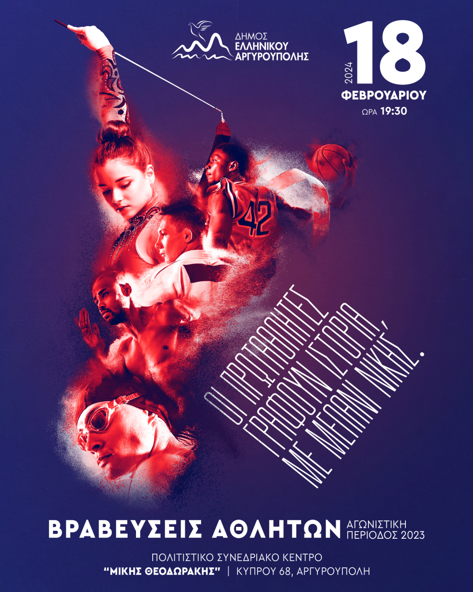 Ο Δήμος Ελληνικού Αργυρούπολης και το τμήμα Αθλητισμού μας προσκαλεί στην εκδήλωση, για τη βράβευση των Αθλητών και των Προπονητών, για την αγωνιστική χρονιά 2023, που θα πραγματοποιηθεί την Κυριακή 18 Φεβρουαρίου στις 19:30, στο Συνεδριακό – Πολιτιστικό Κέντρο “Μίκης Θεοδωράκης”.