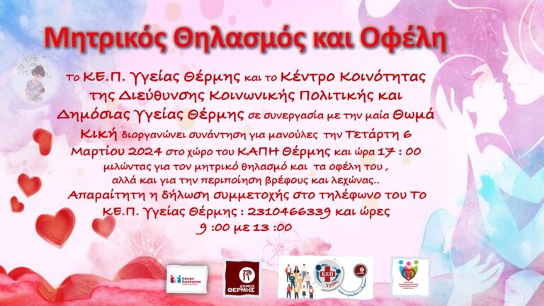 Το ΚΕ.Π. Υγείας Θέρμης και το Κέντρο Κοινότητας της Διεύθυνσης Κοινωνικής Πολιτικής και Δημόσιας Υγείας Θέρμης, σε συνεργασία με την μαία Θωμά Κική διοργανώνουν συνάντηση για Μανούλες μιλώντας για το Μητρικό θηλασμό και τα οφέλη του, αλλά και για περιποίηση βρέφους και λεχώνας.