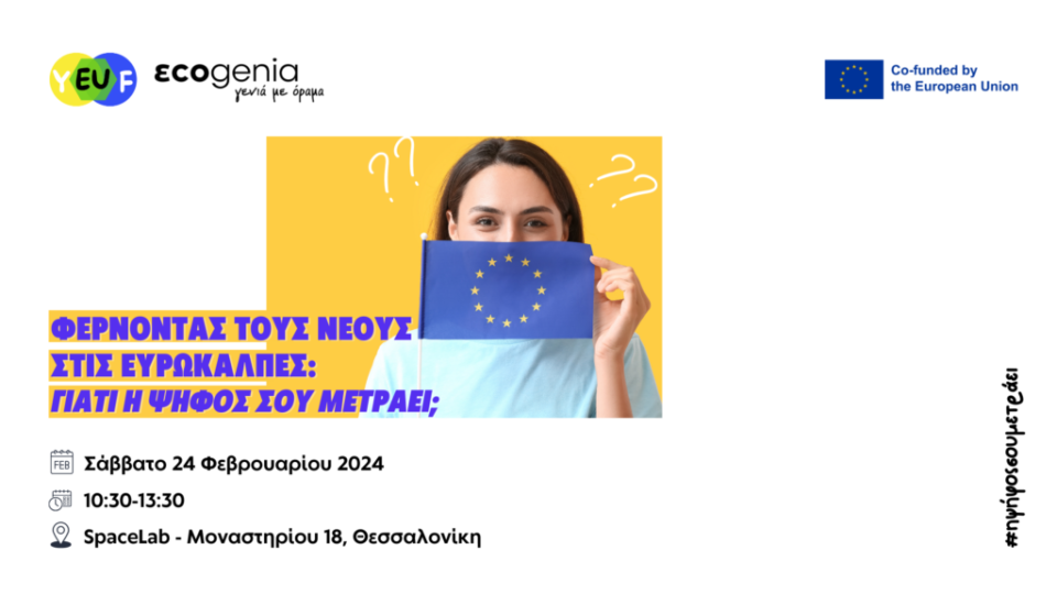 Στο πλαίσιο της προώθησης της ενεργού συμμετοχής των νέων στις ευρωεκλογές και της διευκόλυνσης του διαλόγου για σημαντικά θέματα της σύγχρονης κοινωνίας, η Ecogenia ως εταίρος του προγράμματος YEUF (Youth Empowerment for Universal Franchise), διοργανώνει το Σάββατο 24 Φεβρουαρίου 2024 στη Θεσσαλονίκη από τις 10:30 ως τις 13:30 την εκδήλωση «Φέρνοντας τους νέους στις ευρωκάλπες: γιατί η ψήφος σου μετράει;» με στόχο να ευαισθητοποιήσει τους νέους σχετικά με τις επερχόμενες ευρωεκλογές και να τους εμπνεύσει να προσέλθουν στις κάλπες τον Ιούνιο.