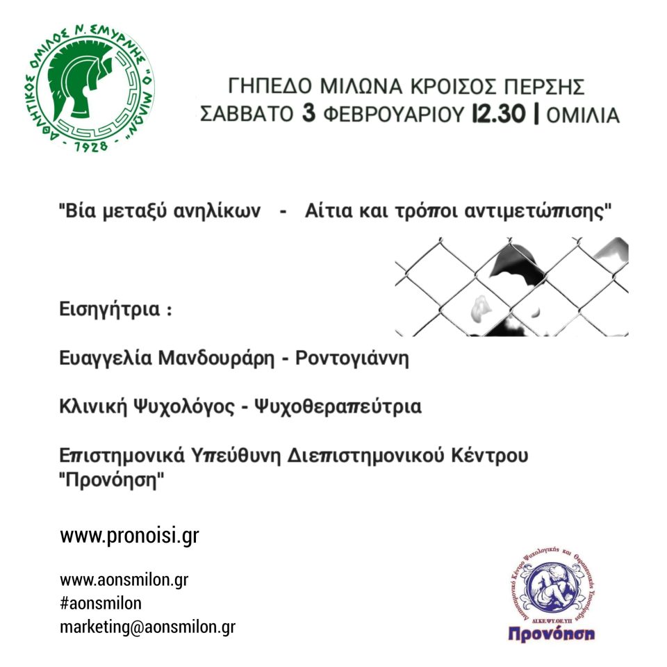 «Βία μεταξύ ανηλίκων – Αίτια και τρόποι αντιμετώπισης» είναι το θέμα ομιλίας που θα πραγματοποιηθεί το Σάββατο 3/2//2024 στο κλειστό γήπεδο Κροίσος Πέρσης (Μεγάλου Βασιλείου και Κοραή) στις 12.30