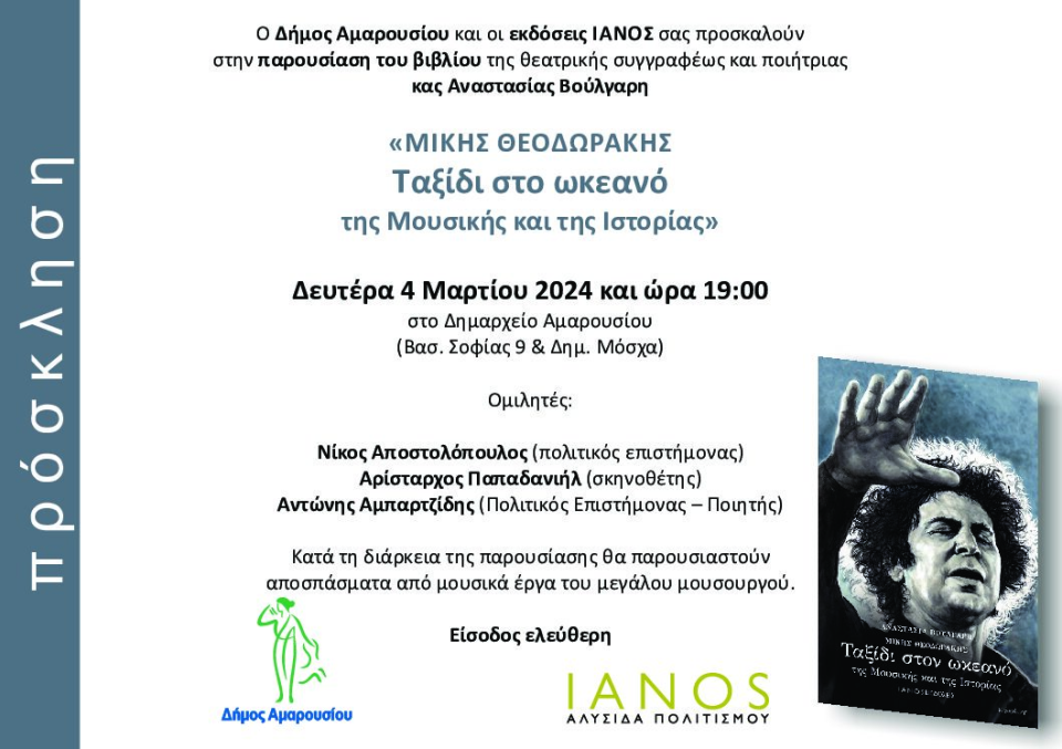 Παρουσίαση του βιβλίου της θεατρικής συγγραφέως και ποιήτριας κας Αναστασίας Βούλγαρη με τίτλο: «ΜΙΚΗΣ ΘΕΟΔΩΡΑΚΗΣ Ταξίδι στον ωκεανό της Μουσικής και της Ιστορίας» από τις εκδόσεις ΙΑΝΟΣ, με την υποστήριξη του Δήμου Αμαρουσίου.