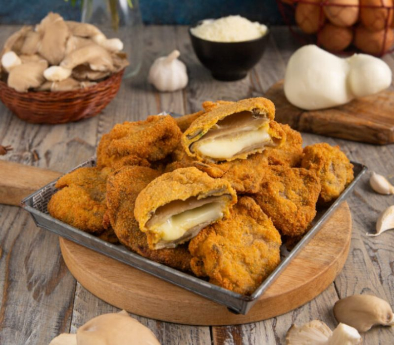 Κόβουμε επίσης το τυρί πρόβολα σε φέτες πάχους 1 εκ., σε μέγεθος κατάλληλο για να περιέχεται ανάμεσα σε δύο μανιτάρια σχηματίζοντας ένα είδος σάντουιτς. Στη συνέχεια κλείνουμε το τυρί σε φέτες μέσα σε δύο μανιτάρια.