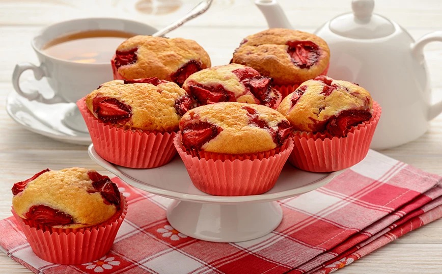 Πλύνε και κόψε σε μικρά κομμάτια τις φράουλες σου και στράγγιξε τες με λίγο χαρτί κουζίνας. Μπορείς φυσικά να χρησιμοποιήσεις καταψυγμένες. Στη συνέχεια, σε ένα μπολ βάλε τα αυγά με τη στέβια και ανακάτεψε καλά. Πρόσθεσε το γάλα αμυγδάλου και το γιαούρτι και ανακάτεψε πάλι. Ύστερα βάλε τη βανίλια και το φακελάκι του ζελέ, το αλεύρι, το μπέικιν πάουντερ και το αλάτι. Ανακάτεψε καλά και ύστερα πρόσθεσε και τις φράουλες (άσε πολύ λίγες φράουλες για τη διακόσμηση). Βάλε το μείγμα σου σε φορμάκια για μάφιν πρόσθεσε από πάνω τις υπόλοιπες φράουλες και ψήσε στον φούρνο για 15 λεπτά στους 180 βαθμούς. Καλή σας απόλαυση!