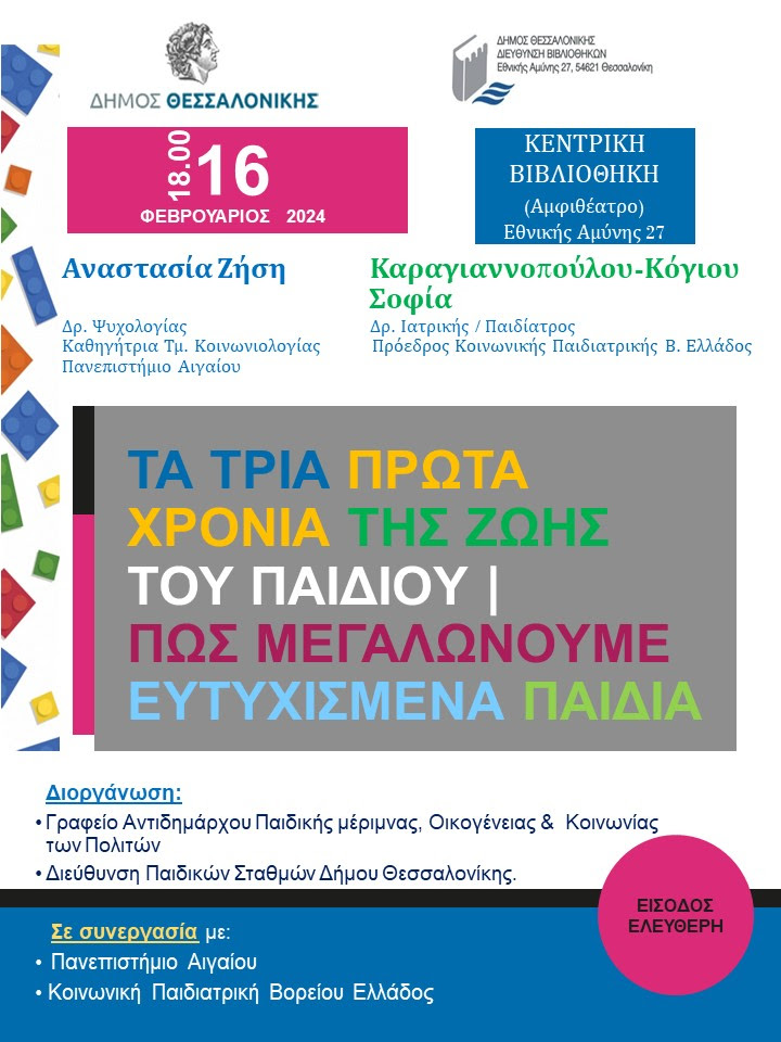 Ο Δήμαρχος Θεσσαλονίκης Στέλιος Αγγελούδης, η Αντιδήμαρχος Παιδικής Μέριμνας, Οικογένειας και Κοινωνίας των Πολιτών Θεοδώρα Λειψιστινού και η Διεύθυνση Παιδικών Σταθμών, σε συνεργασία με το Πανεπιστήμιο Αιγαίου και με την Κοινωνική Παιδιατρική Βορείου Ελλάδος, διοργανώνουν εκδήλωση με θέμα: «Τα τρία πρώτα χρόνια της ζωής του παιδιού – Πώς μεγαλώνουμε ευτυχισμένα παιδιά» την Παρασκευή 16/02/2024, στις 18:00, στην αίθουσα εκδηλώσεων της Κεντρικής Δημοτικής Βιβλιοθήκης.