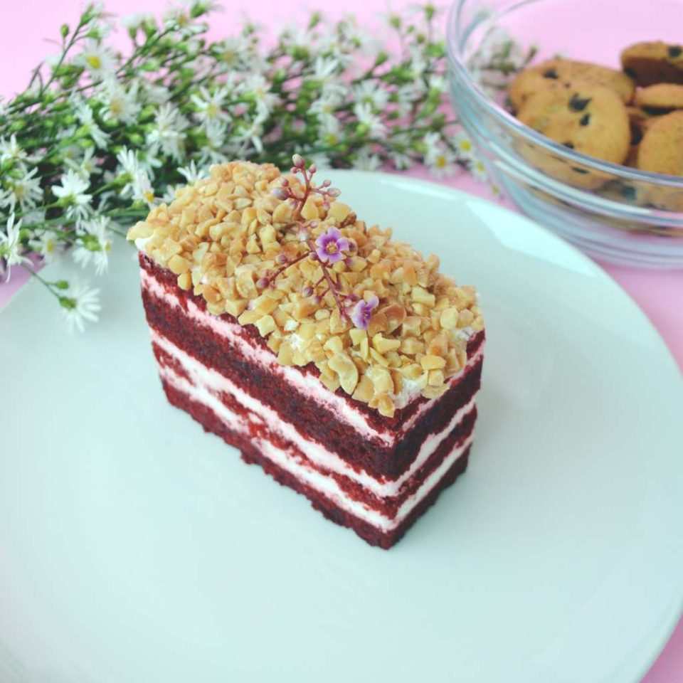 Παίρνουμε το παντεσπάνι και το κόβουμε σε 4 ίσα τετράγωνα με τη βοήθεια ενός χάρακα. Σε αυτό το κέικ δεν χρειάζεται το σιρόπι γιατί η βάση είναι ήδη υγρή και απαλή. Σε ένα πιάτο εναλλάσσουμε ένα τετράγωνο παντεσπάνι με μια στρώση κρέμα τυριού. Όταν φτάσουμε στην τέταρτη στρώση καλύπτουμε όλο το κέικ με την υπόλοιπη κρέμα. Με μια σπάτουλα ισοπεδώνουμε καλά για να γίνει λείο. Για τη διακόσμηση, μπορούμε να κάνουμε γραμμές στην επιφάνεια ή εναλλακτικά μπορούμε να βάλουμε μούρα ή άλλα φρούτα.