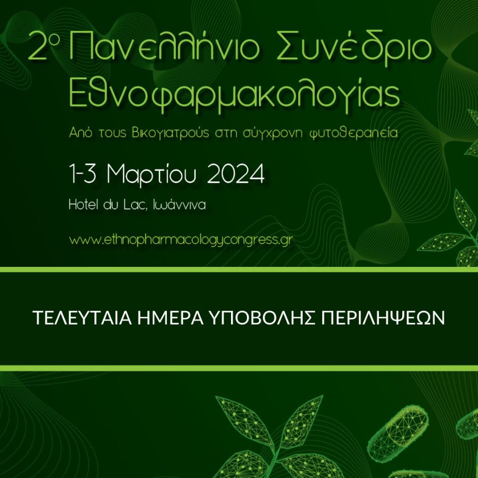 Μόνο μία εβδομάδα απομένει για την έναρξη του 2ου Πανελλήνιου Συνεδρίου Εθνοφαρμακολογίας, το οποίο θα διεξαχθεί από τις 1 έως τις 3 Μαρτίου 2024 στο ξενοδοχείο Hotel du Lac, στα Ιωάννινα.