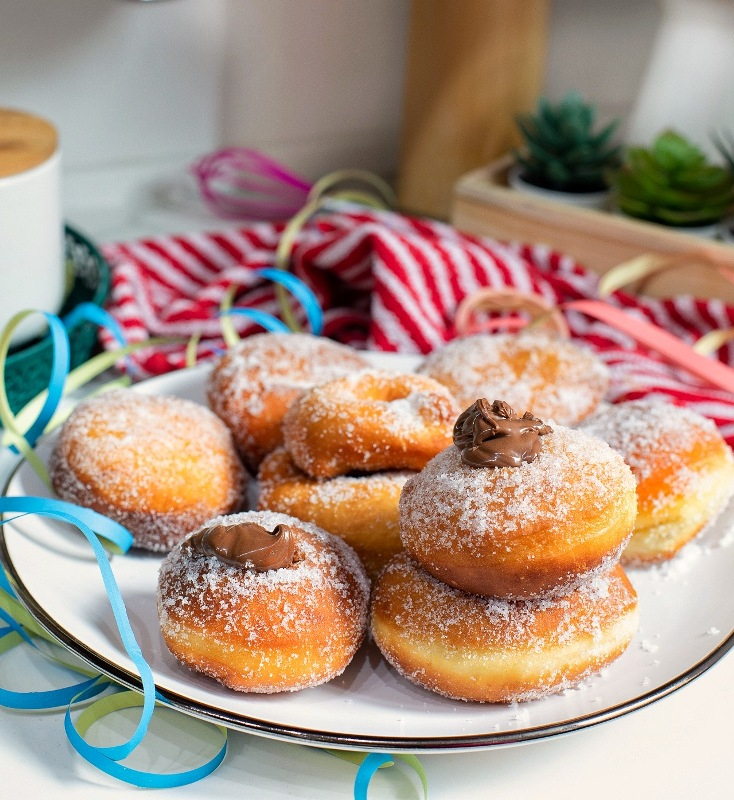 Ζεσταίνουμε 1 λίτρο σπορέλαιο σε ένα τηγάνι με ψηλές πλευρές και τηγανίζουμε ένα donut τη φορά για λίγα λεπτά, γυρίζοντάς τον συχνά. Τα στραγγίζουμε σε απορροφητικό χαρτί, ανοίγουμε τρύπα, τα γεμίζουμε με πραλίνα με μια σακούλα ζαχαροπλαστικής και τα πασπαλίζουμε με ζάχαρη άχνη.