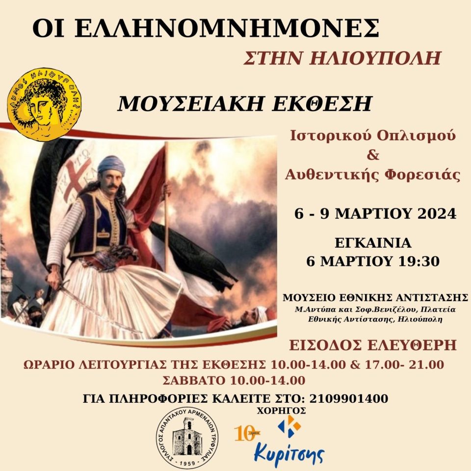 Ο Δήμος Ηλιούπολης σε συνεργασία με τον Εξωραϊστικό και Πολιτιστικό Σύλλογο Απανταχού Αρμεναίων Κυπαρισσίας Μεσσηνίας και τον Σύλλογο «ΕΛΛΗΝΟΜΝΗΜΟΝΕΣ» έχουν την τιμή να σας προσκαλέσουν στην Μουσειακή Έκθεση Ιστορικού Οπλισμού & Αυθεντικής Φορεσιάς του Συλλέκτη κ. Σπύρου Κατσίρα.
