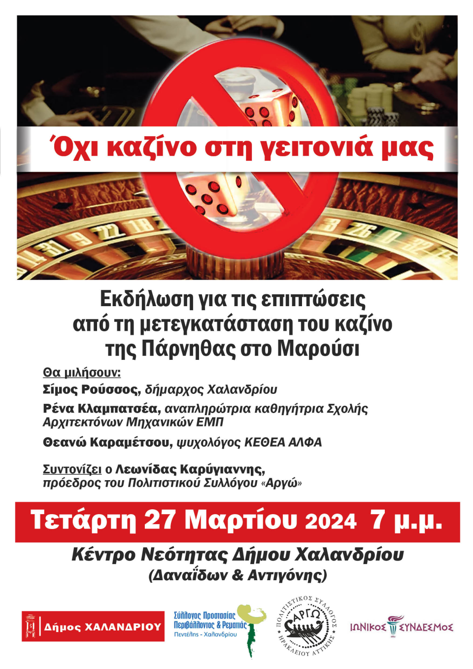 Λίγες μέρες πριν από την εκδίκαση στο ΣτΕ των πέντε προσφυγών ενάντια στη μετεγκατάσταση του καζίνο της Πάρνηθας, στο κτήμα «Δηλαβέρη», απέναντι από το Χαλάνδρι, ο Δήμος Χαλανδρίου, που έχει καταθέσει μαζί με το Σύλλογο Ρεματιάς, μια από τις αιτήσεις ακύρωσης, οργανώνει την εκδήλωση «Όχι καζίνο στη γειτονιά μας», την Τετάρτη 27 Μαρτίου 2024, στο Κέντρο Νεότητας (Δαναΐδων & Αντιγόνης), στις 7 μ.μ., με στόχο την ανάδειξη των επιπτώσεων μιας τέτοιας εξέλιξης.