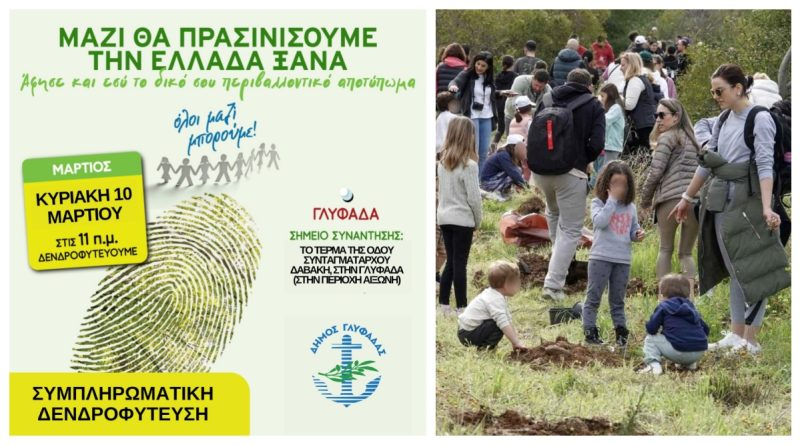 Ο Δήμος Γλυφάδας, στο πλαίσιο της εκστρατείας δενδροφύτευσης του «Όλοι Μαζί Μπορούμε», πρασινίζει το βουνό πάνω από την πόλη. «Ελάτε όλοι να αφήσουμε το περιβαλλοντικό μας αποτύπωμα στον Υμηττό. Να δώσουμε ζωή στο βουνό μας, να ομορφύνουμε την πόλη μας, να πρασινίσουμε το περιβάλλον», τονίζει ο Δήμαρχος Γλυφάδας Γιώργος Παπανικολάου και απευθύνει ένα τεράστιο «ευχαριστώ» σε όλους όσοι συνδράμουν το σημαντικό αυτό έργο. «Πρώτιστο μέλημά μας είναι να φροντίζουμε, να ποτίζουμε και να συντηρούμε με τον καλύτερο τρόπο τα δέντρα αυτά, που ο καθένας από εμάς φυτεύει με πολλή αγάπη», δεσμεύεται ο Αντιδήμαρχος Πρασίνου Σταύρος Γιακουμάκης.