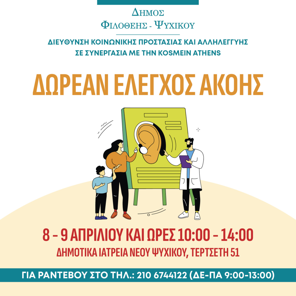 Η Διεύθυνση Κοινωνικής Προστασίας και Αλληλεγγύης του Δήμου Φιλοθέης Ψυχικού σε συνεργασία με γνωστή εταιρεία διοργανώνουν δωρεάν σημαντική δράση Προληπτικού Eλέγχου Aκοής στις 8 & 9 Απριλίου 2024.