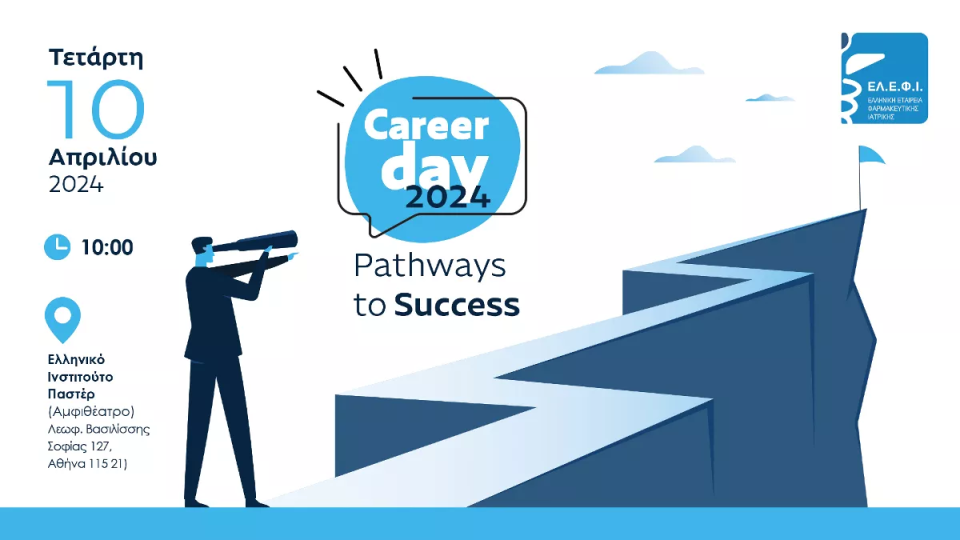 Η Ελληνική Εταιρεία Φαρμακευτικής Ιατρικής (ΕΛ.Ε.Φ.Ι.)ανακοινώνειτη διεξαγωγή ανοικτής εκδήλωσης με τίτλο“CareerDay: Pathways to Success”, την Τετάρτη 10 Απριλίου και ώρα 10:00 στο Αμφιθέατρο του Ελληνικού Ινστιτούτου Παστέρ (Λεωφόρος Βασιλίσσης Σοφίας 127, Αθήνα). Ηεκδήλωση πραγματοποιείται για 2η συνεχή χρονιά, στο πλαίσιο των δράσεων της ΕΛ.Ε.Φ.Ι.γιατην ενίσχυση του επαγγελματικού προσανατολισμού και τη δημιουργίαευκαιριών απασχόλησηςγια τους νέους επιστήμονες στον χώρο της Φαρμακευτικής Ιατρικής.