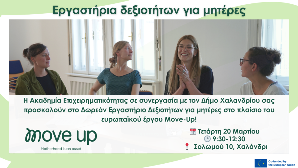 Εργαστήρια αξιολόγησης δεξιοτήτων για μητέρες πραγματοποιεί η Κοινωνική Υπηρεσία του Δήμου Χαλανδρίου σε συνεργασία με την Ακαδημία Επιχειρηματικότητας, στο πλαίσιο του Ευρωπαϊκού Προγράμματος Move Up:ΜΟtherhood valorisation and empowerment for professional development-Upskilling Pathways, στις 20 Μαρτίου 2024, στην αίθουσα εκδηλώσεων της Σολωμού 10 (ισόγειο), από 9:30 έως 12.30.