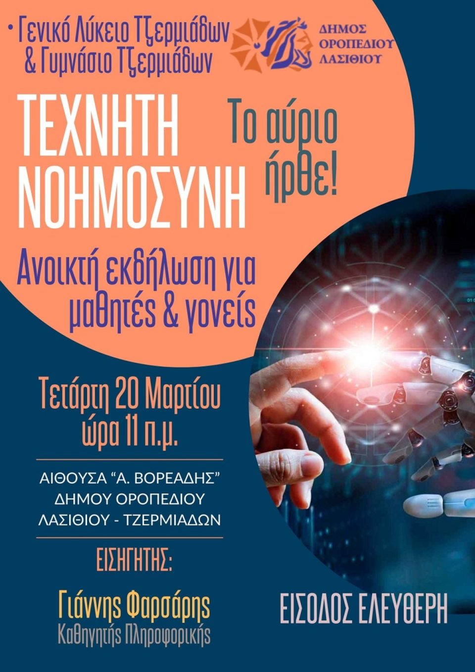 Το εργαστήριο έχει τίτλο: «Τεχνητή Νοημοσύνη: το αύριο ήρθε!», με εισηγητή τον καθηγητή Πληροφορικής κ. Γιάννη Φαρσάρη και θα πραγματοποιηθεί την Τετάρτη 20 Μαρτίου, ώρα 11 π.μ. στην αίθουσα “Αντωνίου Βορεάδη” του Δήμου Οροπεδίου Λασιθίου στο Τζερμιάδων. Την εκδήλωση διοργανώνουν το Γενικό Λύκειο & Γυμνάσιο Τζερμιάδων, με την υποστήριξη του Δήμου Οροπεδίου Λασιθίου.