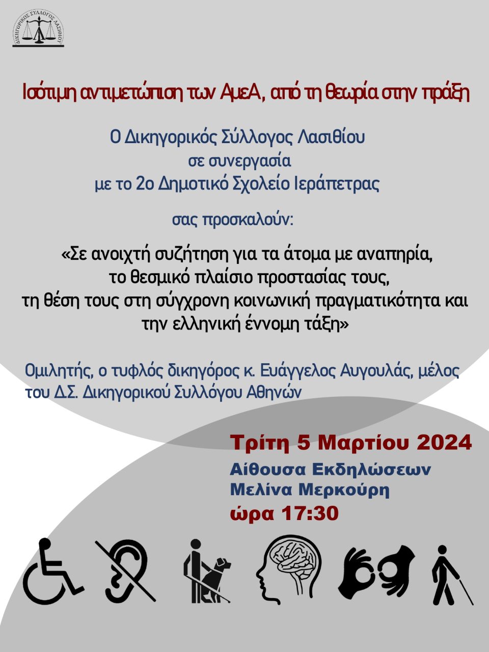 Ο Δικηγορικός Σύλλογος Λασιθίου, σε συνεργασία με το 2ο Δημοτικό Σχολείο Ιεράπετρας, διοργανώνει στις 5 Μαρτίου, ημέρα Τρίτη και ώρα 17:30 στην δημοτική αίθουσα «Μελίνα Μερκούρη» στην Ιεράπετρα, εσπερίδα και ανοιχτή συζήτηση, με θέμα: