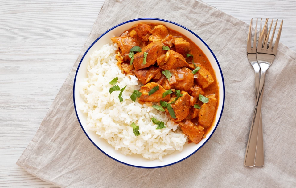 - Σερβίρετε το κοτόπουλο πάνω από το ρύζι και γαρνίρετε με κόλιανδρο.