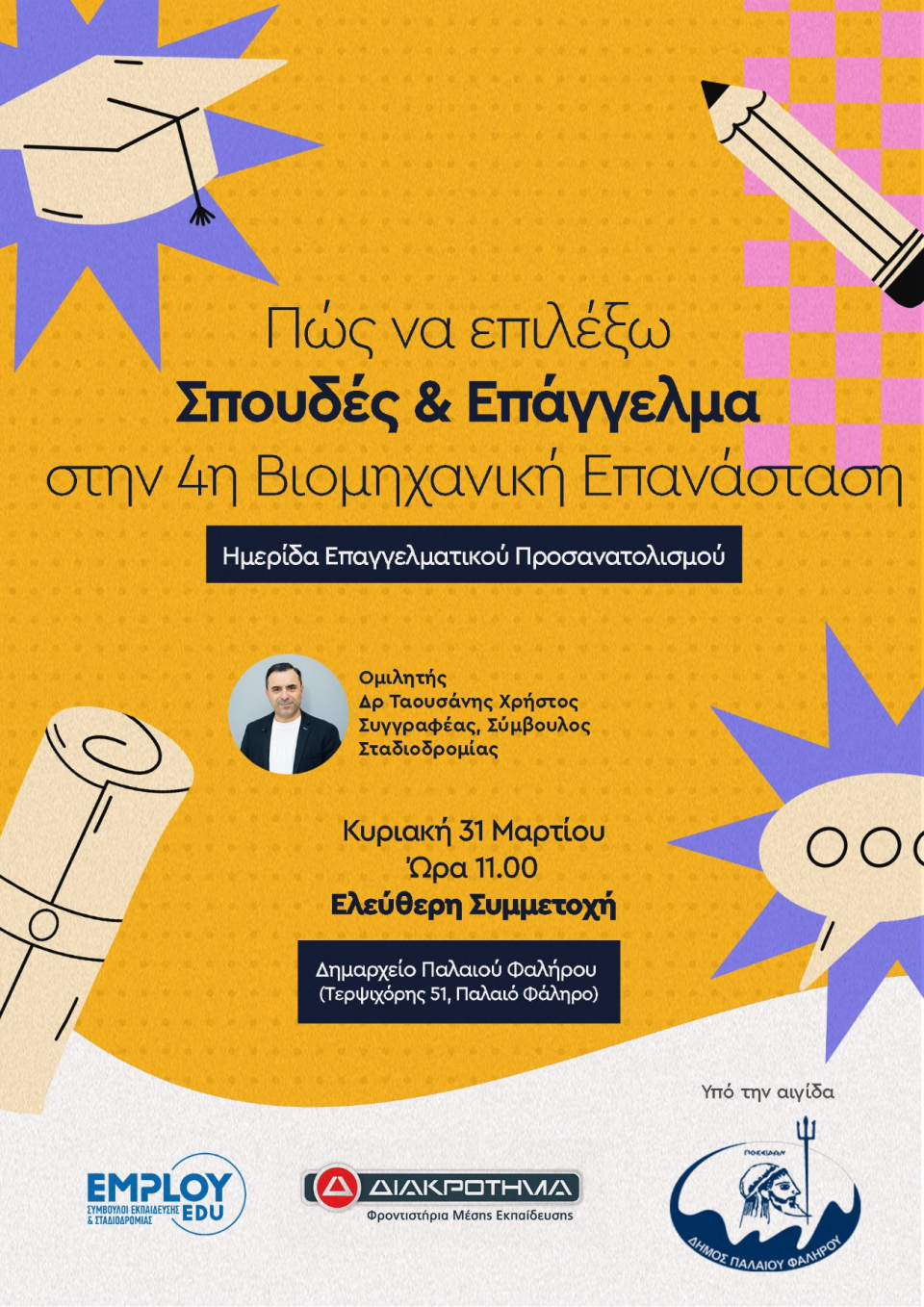 Ο Δήμος Παλαιού Φαλήρου, το Συμβούλιο Εκπαίδευσης και γνωστό Φροντιστήριο Mέσης εκπαίδευσης προσκαλούν το κοινό στην Ημερίδα Επαγγελματικού Προσανατολισμού “Πώς να επιλέξω Σπουδές και επάγγελμα στην 4η Βιομηχανική Επανάσταση”, την Κυριακή 31 Μαρτίου και ώρα 11:00 στον Πολυχώρο του Δημαρχείου Παλαιού Φαλήρου. Ομιλητής της ανωτέρω εκδήλωσης θα είναι ο Δρ. Ταουσάνης Χρήστος, Συγγραφέας & Σύμβουλος Σταδιοδρομίας.