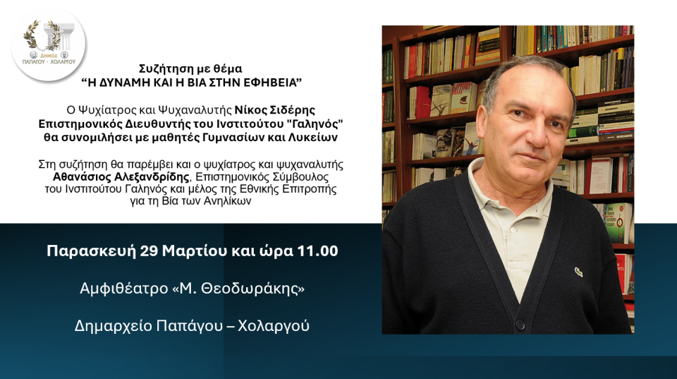 Ο Δήμος Παπάγου – Χολαργού, σε συνεργασία με το Ινστιτούτο Ψυχικής Υγείας Παιδιών και Εφήβων “Γαληνός”, διοργανώνει συζήτηση με θέμα “Η ΔΥΝΑΜΗ ΚΑΙ Η ΒΙΑ ΣΤΗΝ ΕΦΗΒΕΙΑ”, την Παρασκευή 29 Μαρτίου και ώρα 11.00, στο Αμφιθέατρο «Μ. Θεοδωράκης» του Δημαρχείου Παπάγου – Χολαργού (Λ. Περικλέους 55, Χολαργός).