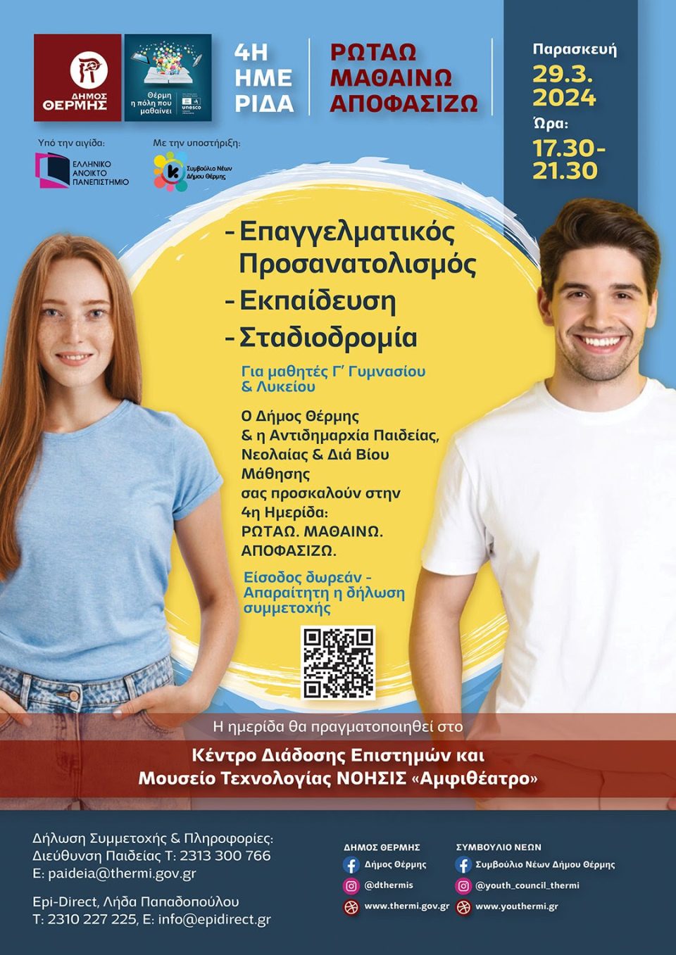 Ημερίδα «ΡΩΤΑΩ. ΜΑΘΑΙΝΩ. ΑΠΟΦΑΣΙΖΩ.» με θέμα τον Επαγγελματικό Προσανατολισμό, την Εκπαίδευση και τη Σταδιοδρομία, διοργανώνει ο δήμος Θέρµης & η Αντιδηµαρχία Παιδείας, Νεολαίας & ∆ιά Βίου Μάθησης, υπό την αιγίδα του Ελληνικού Ανοικτού Πανεπιστημίου, για 4η συνεχόμενη χρονιά.