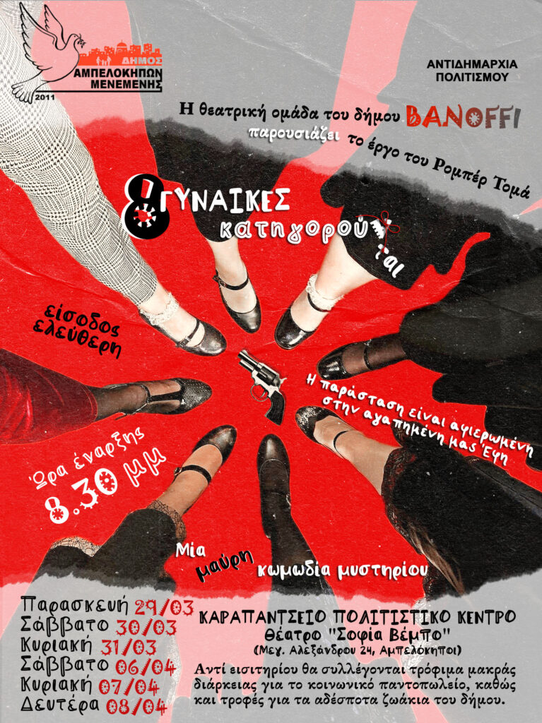Ο Δήμος Αμπελοκήπων-Μενεμένης και η Αντιδημαρχία Πολιτισμού σας προσκαλούν στην θεατρική παράσταση του Ρομπέρ Τομά «8 γυναίκες κατηγορούνται» που θα παρουσιάσει η θεατρική ομάδα του Δήμου Banoffi.Ένας φόνος… Οχτώ ύποπτες αποκλεισμένες από τη χιονοθύελλα σε μια απομακρυσμένη έπαυλη. Άραγε ποια είναι η δολοφόνος;