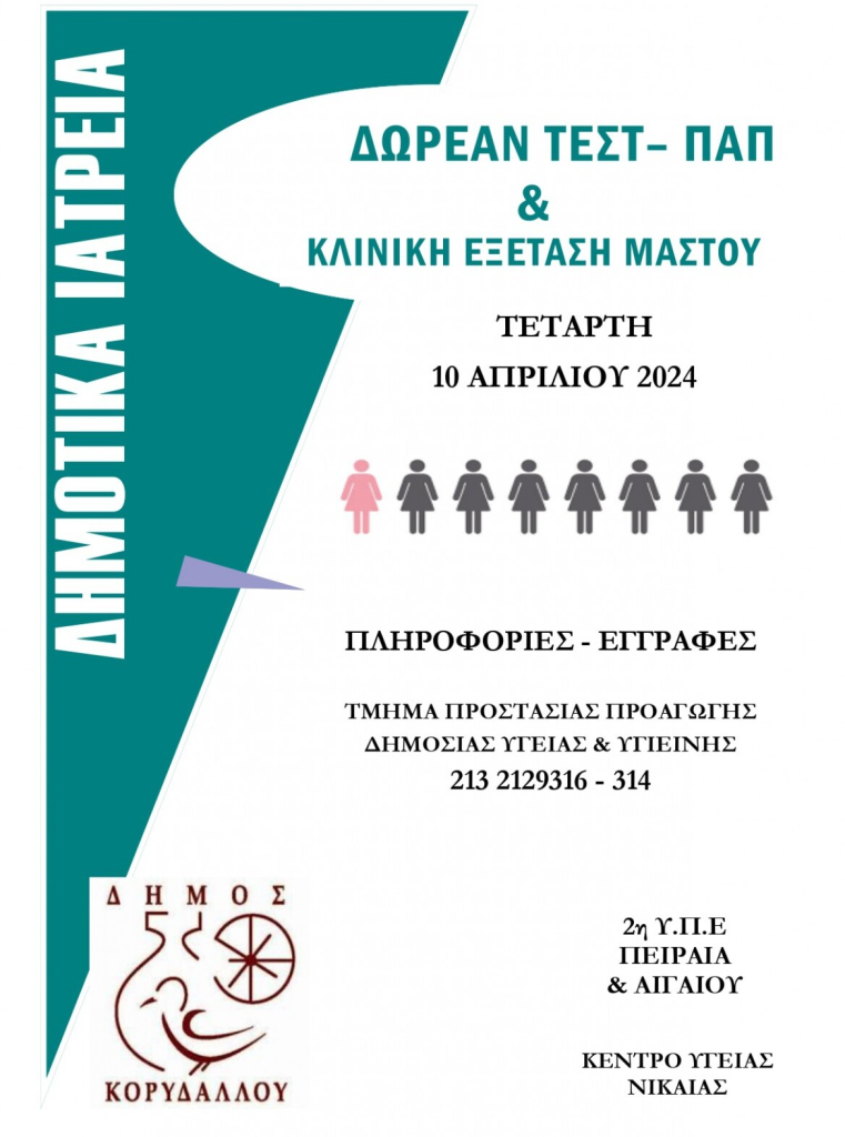 Ο Δήμος Κορυδαλλού, σε συνεργασία με το Κ.Υ, διενεργεί την Τετάρτη 10 Απριλίου 2024 δωρεάν γυναικολογικό έλεγχο που θα περιλαμβάνει κλινική εξέταση (ψηλάφηση) μαστού και λήψη ΤΕΣΤ ΠΑΠ, στο χώρο των Δημοτικών Ιατρείων, Ξενοφώντος 5 & Πελοπίδα .