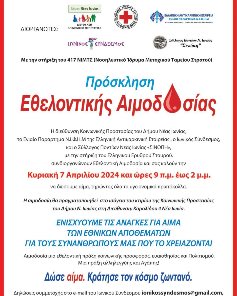 Στο πλαίσιο της Παγκόσμιας Ημέρας Υγείας η Διεύθυνση Κοινωνικής Προστασίας του Δήμου Νέας Ιωνίας, το Ενιαίο παράρτημα Ν.Ι.Φ.Η.Μ της Ε.Α.Ε, ο Ιωνικός Σύνδεσμος, και ο Σύλλογος Ποντίων «ΣΙΝΩΠΗ» με την στήριξη του Ελληνικού Ερυθρού Σταυρού, συνδιοργανώνουν Εθελοντική Αιμοδοσία και καλούν όσους ενδιαφέρονται την Κυριακή, 7 Απριλίου 2024, και ώρες 9.00 π.μ. έως 2.00 μ.μ, στο ισόγειο του κτηρίου της Κοινωνικής Προστασίας του Δήμου Νέας Ιωνίας (Καρολίδου 4 Ν.Ι.) να δώσουν αίμα, τηρώντας όλα τα υγειονομικά πρωτόκολλα.