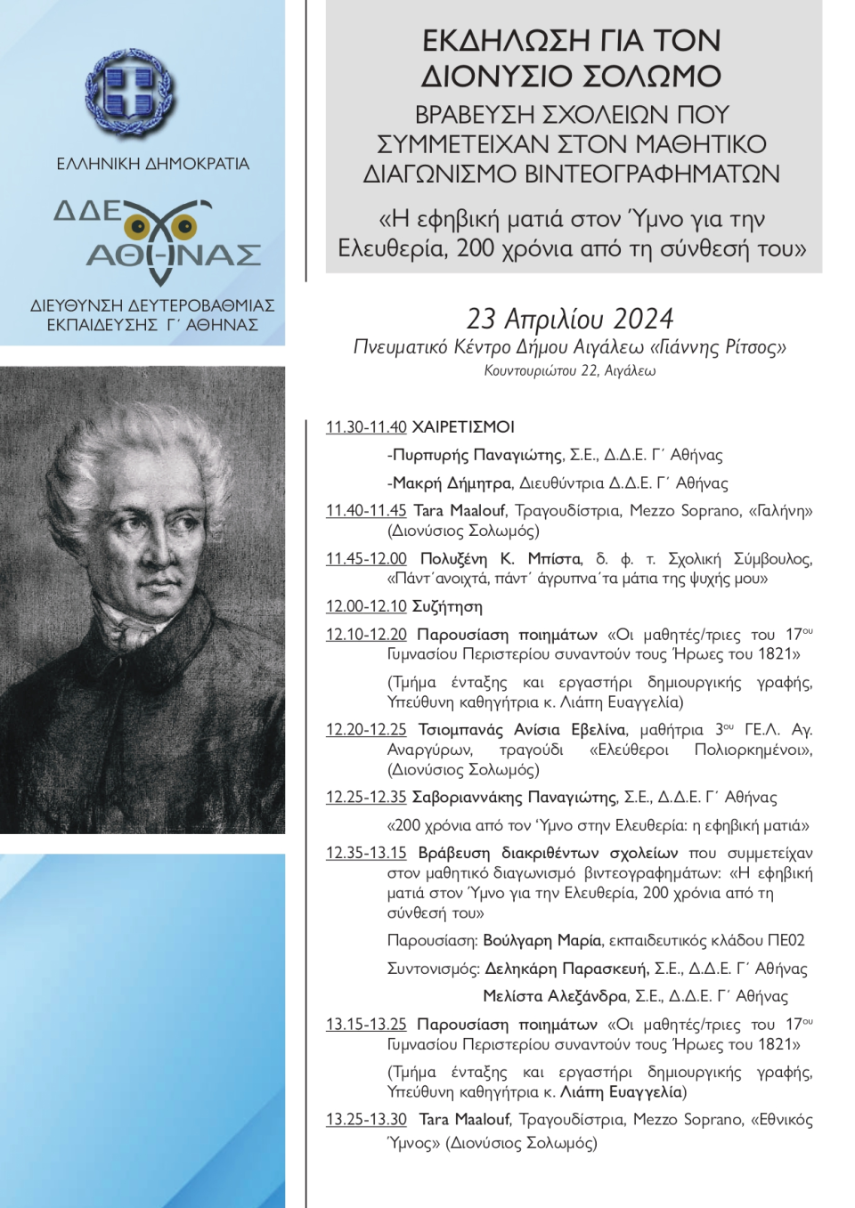 ΚεντρικήΚοινωνικάΕκδήλωση αφιερωμένη στον Διονύσιο Σολωμό στο Δήμο Αιγάλεω by xristiana19 Απριλίου 202419 Απριλίου 20240317 Share00 19/4/2024 Πηγήhttps://www.xtypos.gr