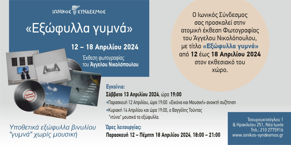 Ο Ιωνικός Σύνδεσμος προσκαλεί το κοινό στην ατομική έκθεση Φωτογραφίας του Άγγελου Νικολόπουλου, με τίτλο «Εξώφυλλα γυμνά» από 12 έως 18 Απριλίου 2024 στον εκθεσιακό του χώρο.