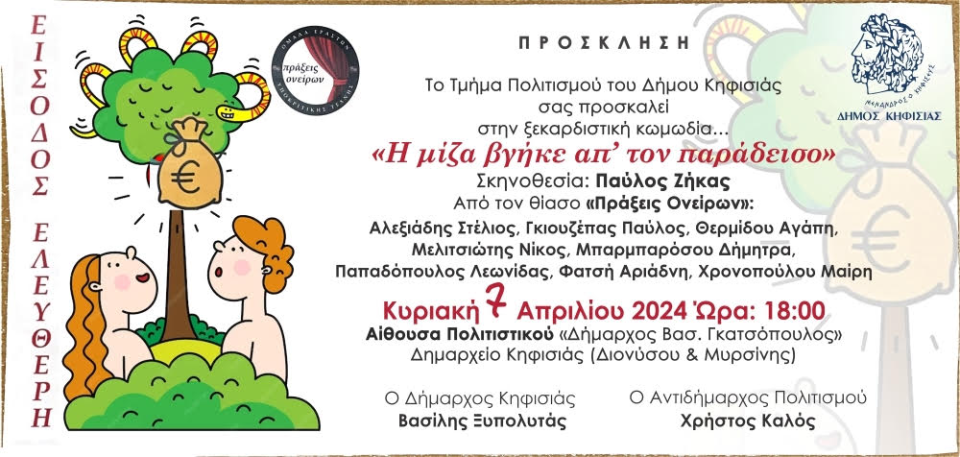 Το Τμήμα Πολιτισμού του Δήμου Κηφισιάς προσκαλεί τους πολίτες στην ξεκαρδιστική κωμωδία «Η μίζα βγήκε απ’ τον παράδεισο».