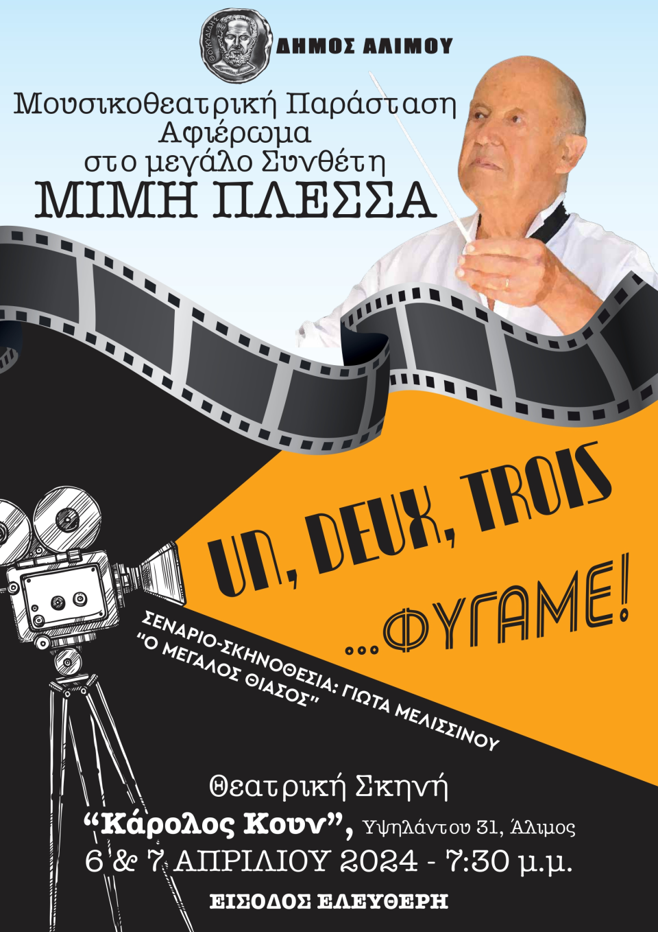 Μια δωρεάν Μουσικοθεατρική παράσταση αφιερωμένη στον Μίμη Πλέσσα θα παρουσιαστεί στη Θεατρική Σκηνή Αλίμου «Κάρολος Κουν (Υψηλάντου και Θησείου) το Σάββατο 6 και την Κυριακή 7 Απριλίου 2024 στις 7:30 μ.μ. .