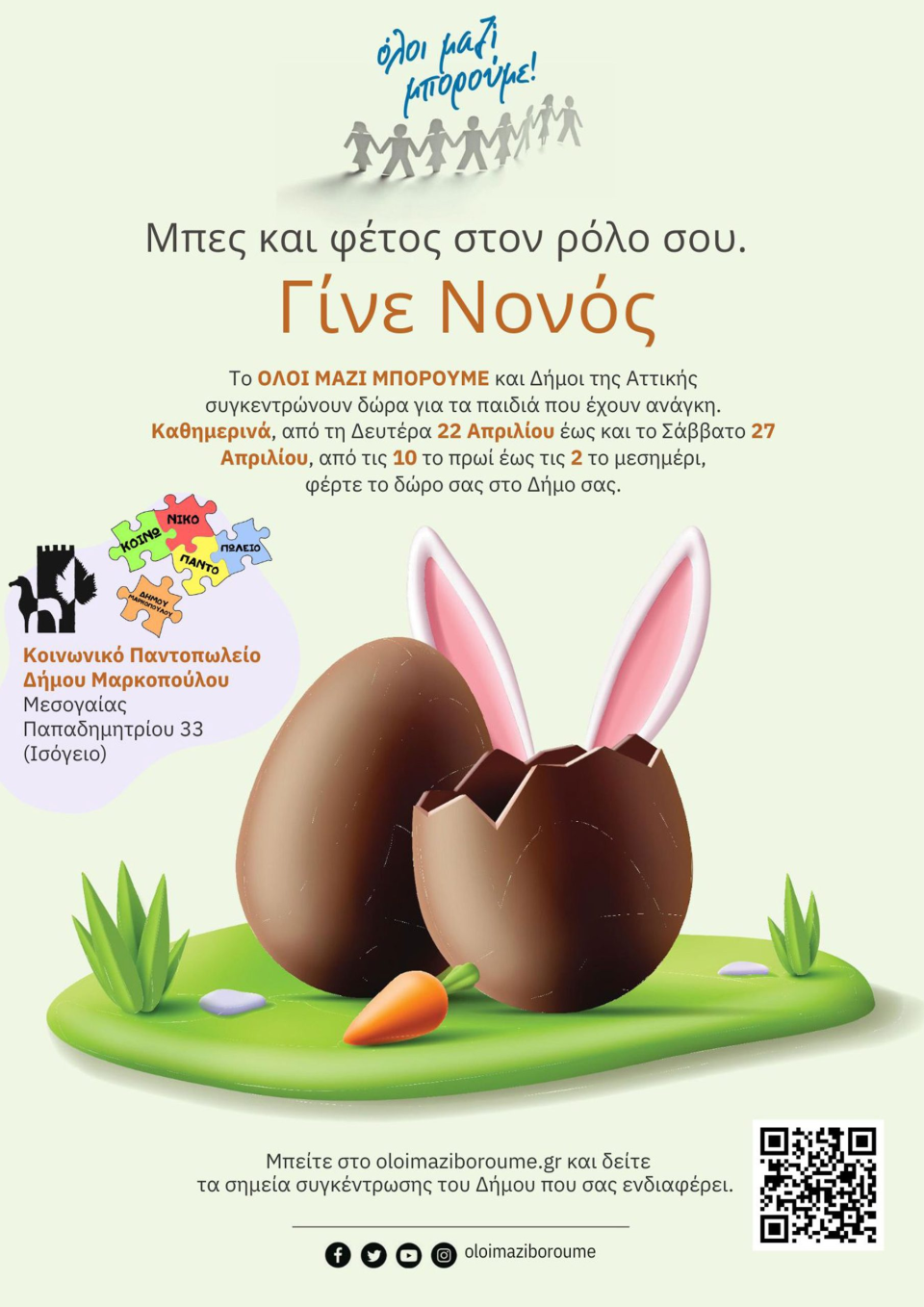 Οι Δήμοι της Αττικής διοργανώνουν δράση συγκέντρωσης Πασχαλινών δώρων, για τα παιδιά που έχουν ανάγκη με σύνθημα «Μπες και φέτος στο ρόλο σου! Γίνε Νονός» σε συνεργασία με το ΟΛΟΙ ΜΑΖΙ ΜΠΟΡΟΥΜΕ.