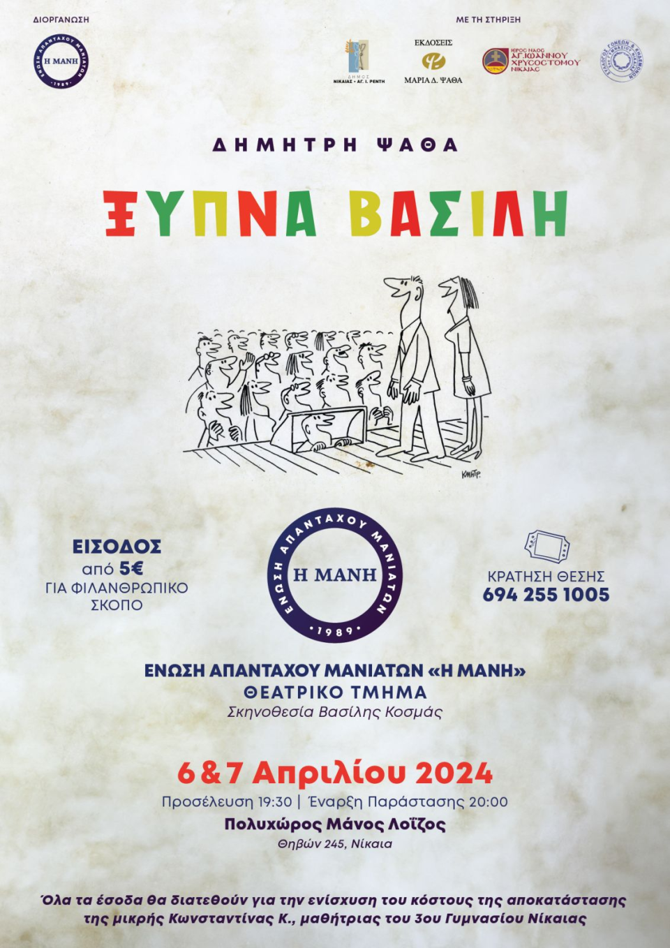 Με την υποστήριξη του Δήμου Νίκαιας-Αγ.Ι. Ρέντη και του Συλλόγου Γονέων 3ου Γυμνασίου Νίκαιας, η θεατρική ομάδα της Ένωσης Απανταχού Μανιατών «Η Μάνη» παρουσιάζει το θεατρικό έργο του Δημήτρη Ψαθά «Ξύπνα Βασίλη», σε σκηνοθεσία Βασίλη Κοσμά στις 6 και 7 Απριλίου και ώρα 7.30 μ.μ Απριλίου 2024 ώρα 19:30, στον Πολιτιστικό Πολυχώρο «Μάνος Λοϊζος» (Θηβών 245).