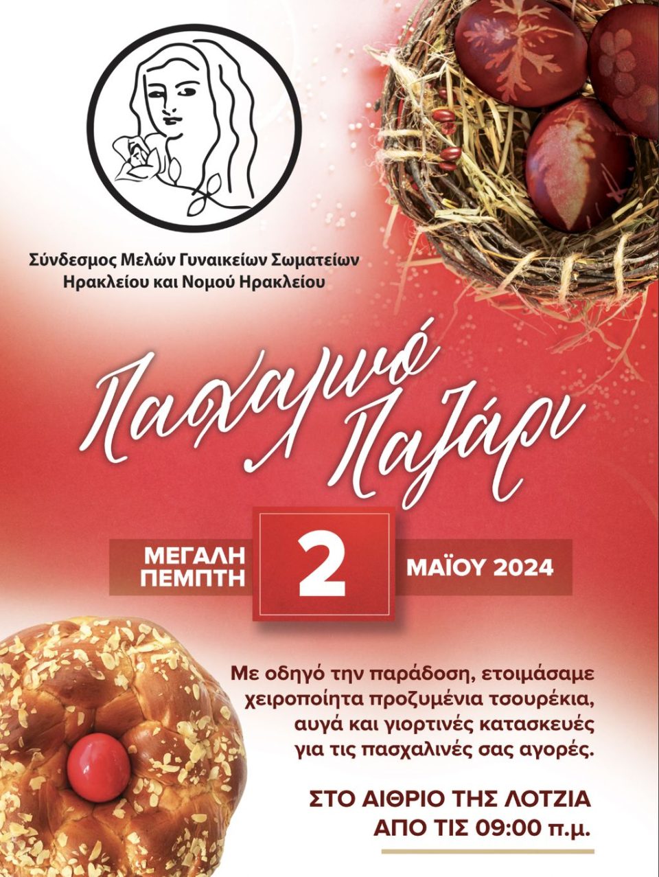 Το καθιερωμένο Πασχαλινό Παζάρι του “Συνδέσμου Μελών Γυναικείων Σωματείων Ηρακλείου και Ν. Ηρακλείου” οργανώνεται και φέτος τη Μεγάλη Πέμπτη 2/5/2024 από τις 9.00 το πρωί, στο Αίθριο της Λότζια, στο Ηράκλειο.