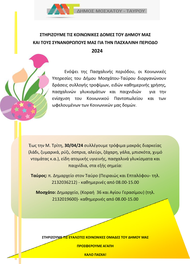 ΚεντρικήΚοινωνικάO Δήμος Μοσχάτου-Ταύρου συγκεντρώνει μεταξύ άλλων τρόφιμα για τους ωφελούμενους στις κοινωνικές του δομές by xristiana19 Απριλίου 202419 Απριλίου 20240386 Share00 19/4/2024 Πηγήhttps://www.xtypos.gr